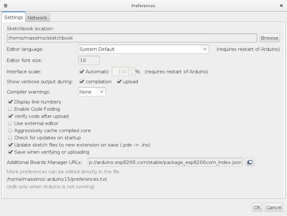 Installing a Fishino Package into Arduino IDE is a simple task; at first, run Arduino Ide and open Preferences page :