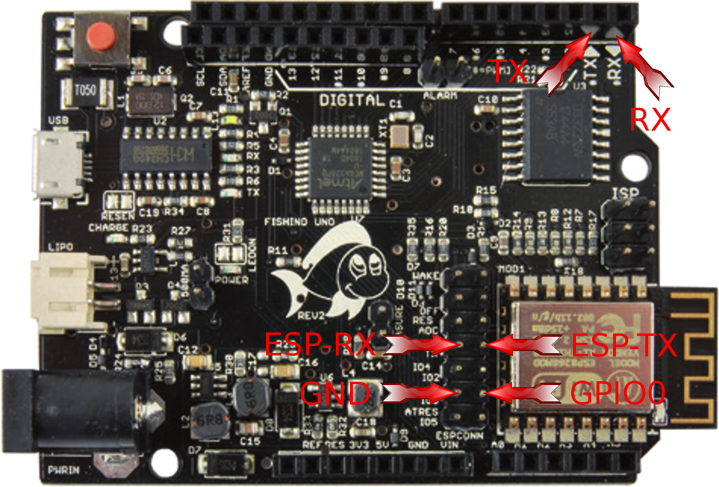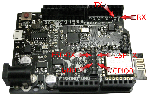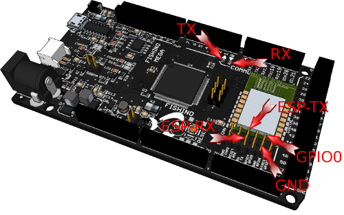 - Connect Fishino TX pin with ESP-TX pin on ESP connector, and Fishino RX pin with ESP-RX pin on ESP connector (see picture)