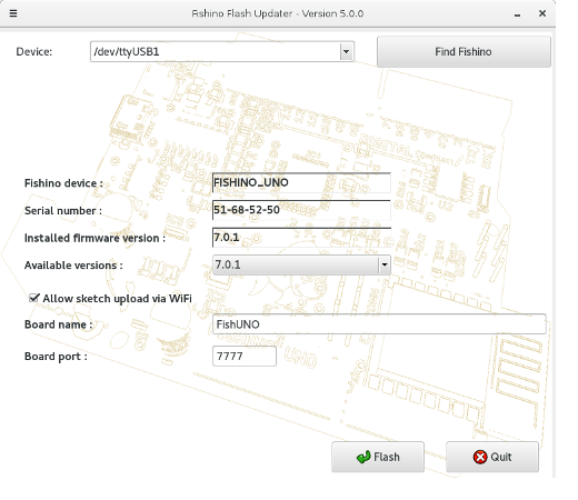 - Run FishinoFlasher application, checking that an internet connection is available.