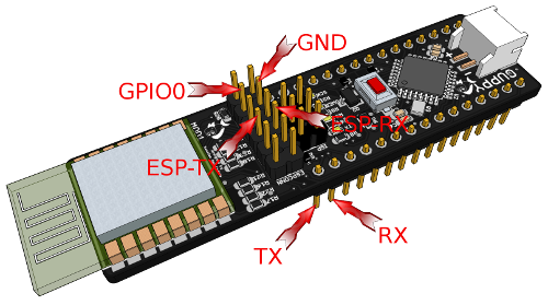 - Connect GPIO0 pin on ESP connector to ground with a cable or a jumper ( see picture)