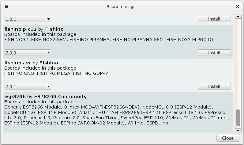 Just scroll near end to find the 2 Fishino Packages and install the one you need, or both if you have both Fishino and Fishino32 boards.