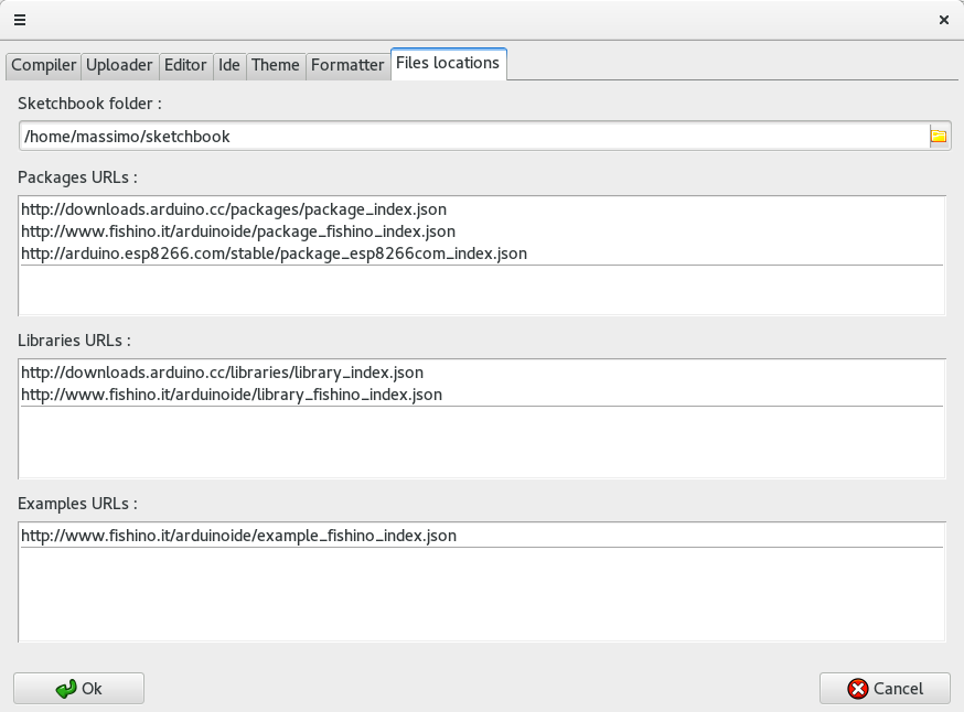 You can notice various points here; the autosetup should have pre-filled them with Fishino paths, even if it has not installed the packages; just check that Fishino's paths are correctly set inside 'Packages URLs', 'Libraries URLs' and Examples URLs' fields; if they'r not there, just add them as shown in the picture above. Once done, press OK button.