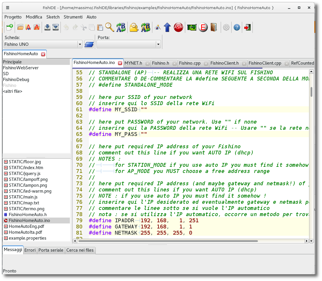 Let's open the FishinoHomeAuto.ino sketch inside IDE, choosing it among Fishino library's examples; we're using our FishIDE application, but you can use Arduino IDE as usual.