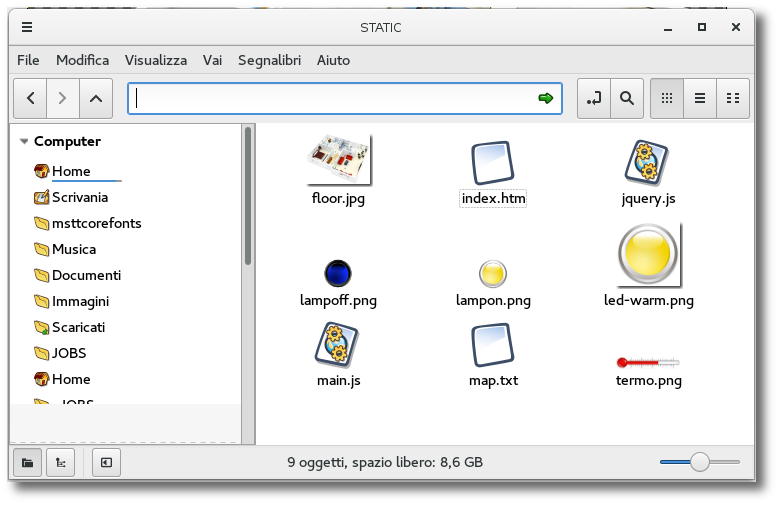 The application can be customized with few files; index.htm file contains the html code with flat picture's link, map.txt file which maps Fishino's I/O wth the appliances and their position over flat's pictureand some image files containing the images on the page (floor.jpg, lampon.png, lampoff.png, termo.png).